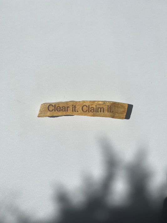 Clear + cleanse you and your space with our brand new affirmation Palo Santo sticks. Each stick is etched with affirmations on the front + back that say " Clear Mind, Big Magic" and "Clear it. Claim it."