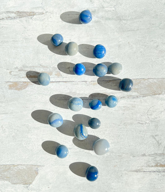 Blue Aventurine tumbled pocket stones are polished, smooth crystals prized for their serene blue hues and calming energy. Each stone features a blend of soft to deep blue shades, often interspersed with subtle sparkles or streaks of quartz and mica, creating a natural, captivating sheen.