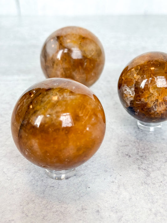 These stunning Golden Healer Spheres are a mesmerizing, high-vibrational crystal known for its warm golden hues and powerful healing energy. This stunning sphere is a variety of quartz infused with iron oxide, creating rich shades of gold, amber, and honey that shimmer under the light.