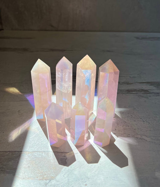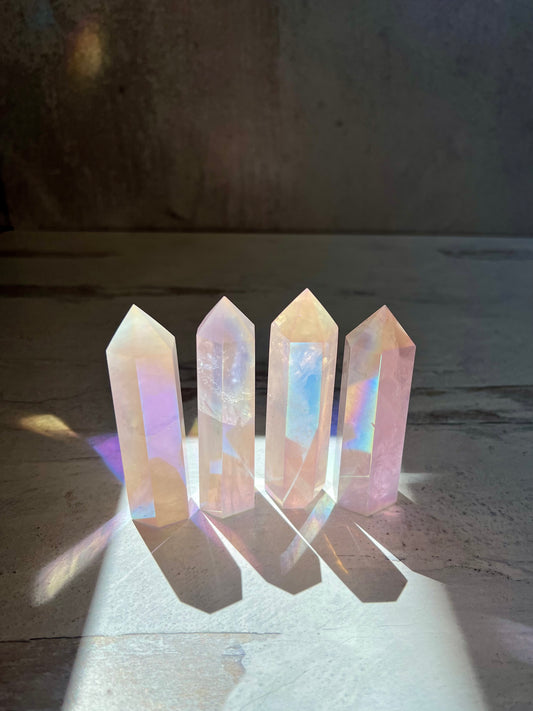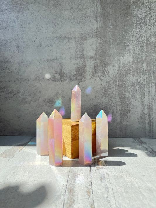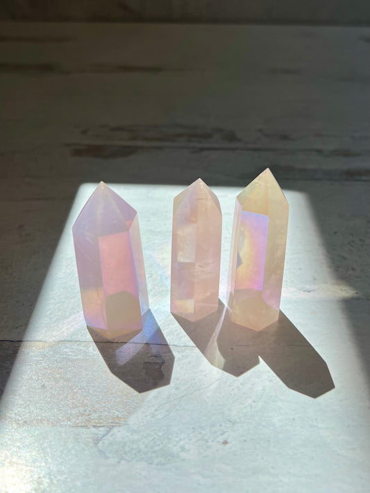 These beautifully crafted Rose Quartz towers with Aura Quartz coating will help you bring into form self-love, healing, and compassion. Pink is connected to the heart chakra and this is a wonderful stone for unlocking the pathway of love. Due to the angelic aura coating on these stones, they are high vibrational. These are a great addition to any sacred space and/or hold while meditating!