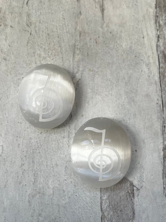 Engraved Selenite Cho Ku Rei Reiki Symbol Palm Stone
