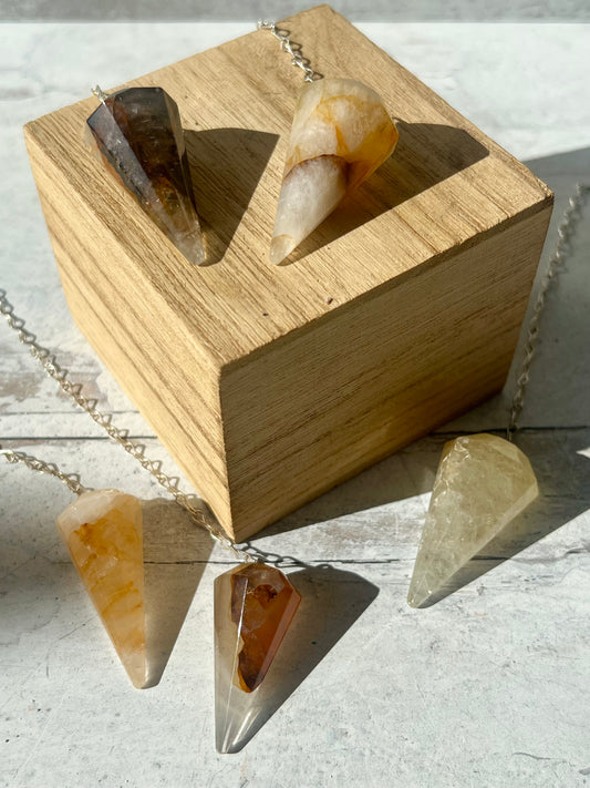 Ask the pendulum your deep questions + let the universe help you sort it out. A Golden Healer Pendulum is a powerful spiritual tool infused with the high-vibrational energy of Golden Healer Quartz, a rare variety of quartz with iron oxide inclusions that give it a golden or yellow hue. It is revered for its ability to connect with divine light, facilitate deep healing, and enhance spiritual guidance. It's shaped in a sacred geometry formation which enhances the activities between the left and right hemisphere of your brain. It also aids in connecting with your higher self and spiritual growth.