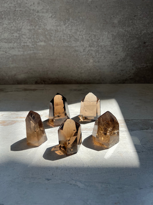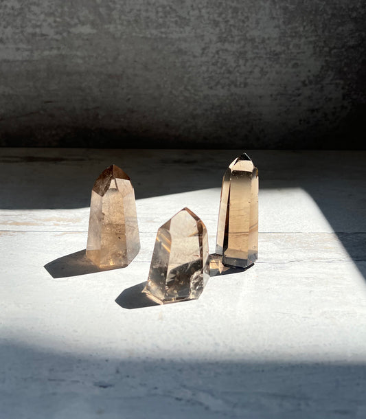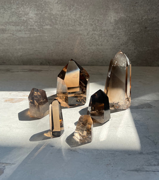 These Smoky Quartz towers are ultra clear + super high quality! Smoky Quartz is a great stone for grounding your energy, connecting to your root chakra, blocking negative energy and electromagnetic frequencies (EMF's) as well as bringing balance back into your mind and body. Smoky Quartz is a tried and true stone that is super popular for its magical qualities!