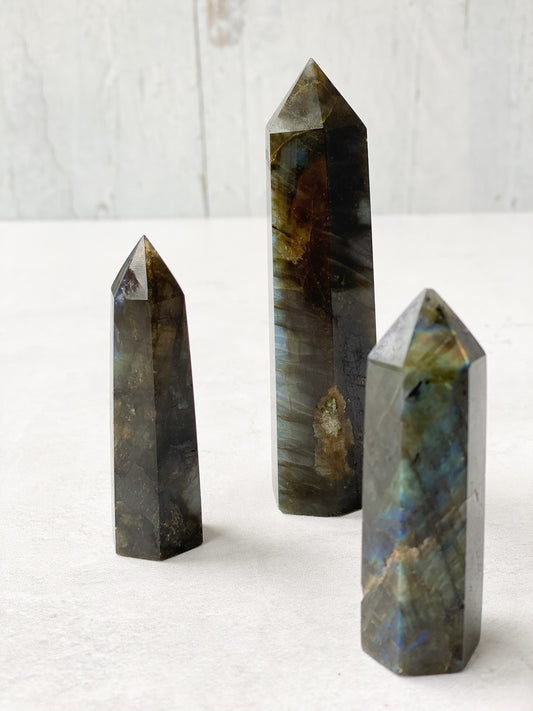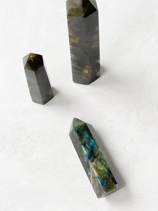 Labradorite has a historic tale that says that the Northern Lights fell from the sky into these stones. Labradorite is a favorite at Spirit + Soul Studio and these beautiful towers have lots of flash and magic and these towers HAVE IT.  They have lots of blue and even yellow flashes within the stone!  It's amazing to see them catch the light!