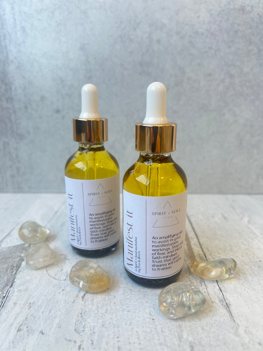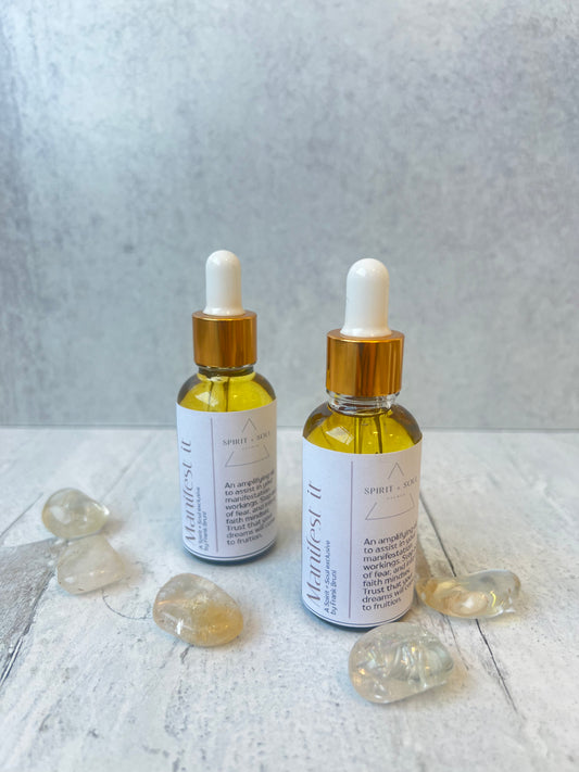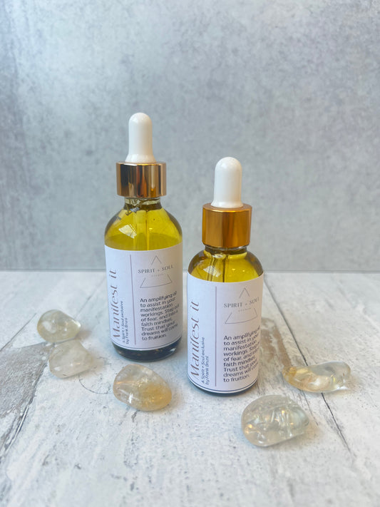 From warming orange notes to spicy clove and refreshing calendula, the Manifest It Intention Oil is an accelerant and amplifying intention oil to assist in your manifestation workings. From vision boards to tea lights to wearing on the body this intention oil is sunlight and optimism in a bottle! This oil assists in stepping out of the fear mindset into the faith mindset. Trust with faith that your manifestations will come into fruition under grace.