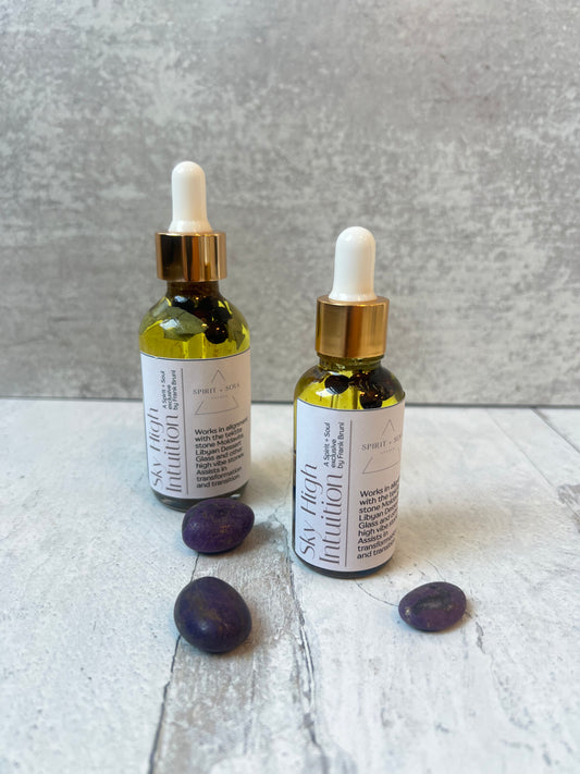 Sky High Intuition Oil by Frank Bruni is an intense constructed oil that works closely in alignment with the tektite stone Moldavite and Libyan Dessert Glass along with other high vibration stones. This oil is VERY potent and assists in spiritual transformation and transition!
