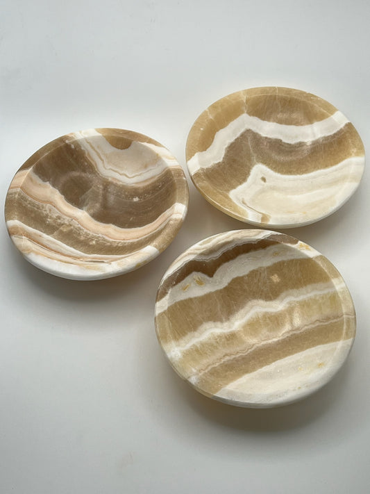 Hold + charge your favorite crystals and stones in these beautiful Calcite bowls! Known as a stone of cleansing and renewal, Calcite is believed to clear stagnant energy, dissolve emotional blockages, and amplify positive vibrations. Each bowl radiates soothing, high-frequency energy that encourages mental clarity, spiritual growth, and emotional balance.